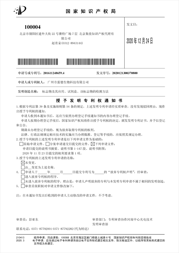 其中的一件核心技術(shù)發(fā)明專利的名稱為《標(biāo)志物及其應(yīng)用、試劑盒、該標(biāo)志物的檢測方法》,申請?zhí)枮椤?01611248659.4”,該發(fā)明于2020年12月24日獲得授權(quán),這也是我司首次在類風(fēng)濕關(guān)節(jié)炎(RA)血清學(xué)“標(biāo)志物”方面獲得授權(quán)的發(fā)明專利。