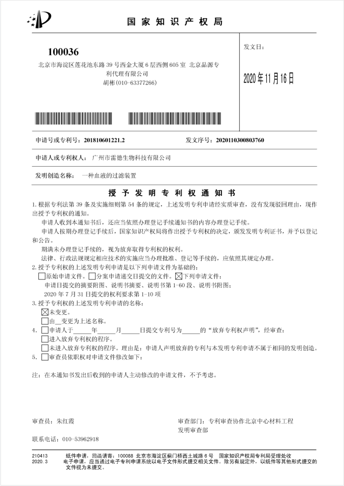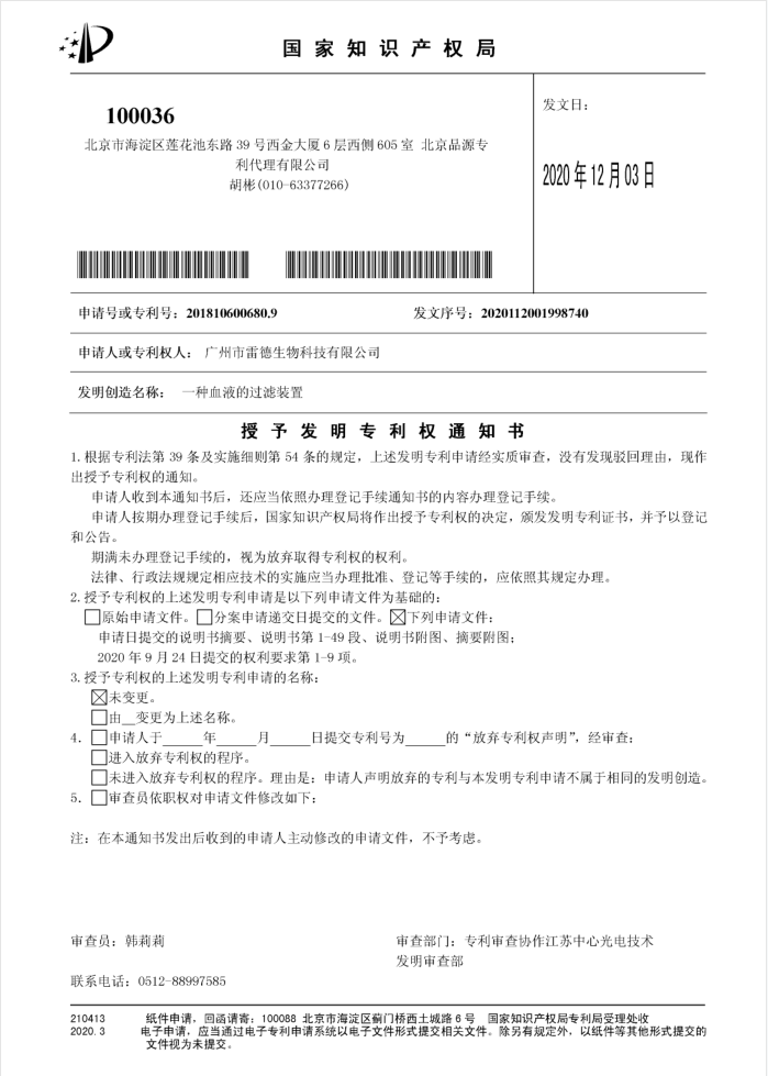 另外獲得授權(quán)的兩件核心技術(shù)發(fā)明專利名稱均為《一種血液的過濾裝置》,申請?zhí)枮榉謩e“201810601221.2”和“201810600680.9”,該兩件發(fā)明陸續(xù)于2020年11月16日與2020年12月03日獲得授權(quán)。