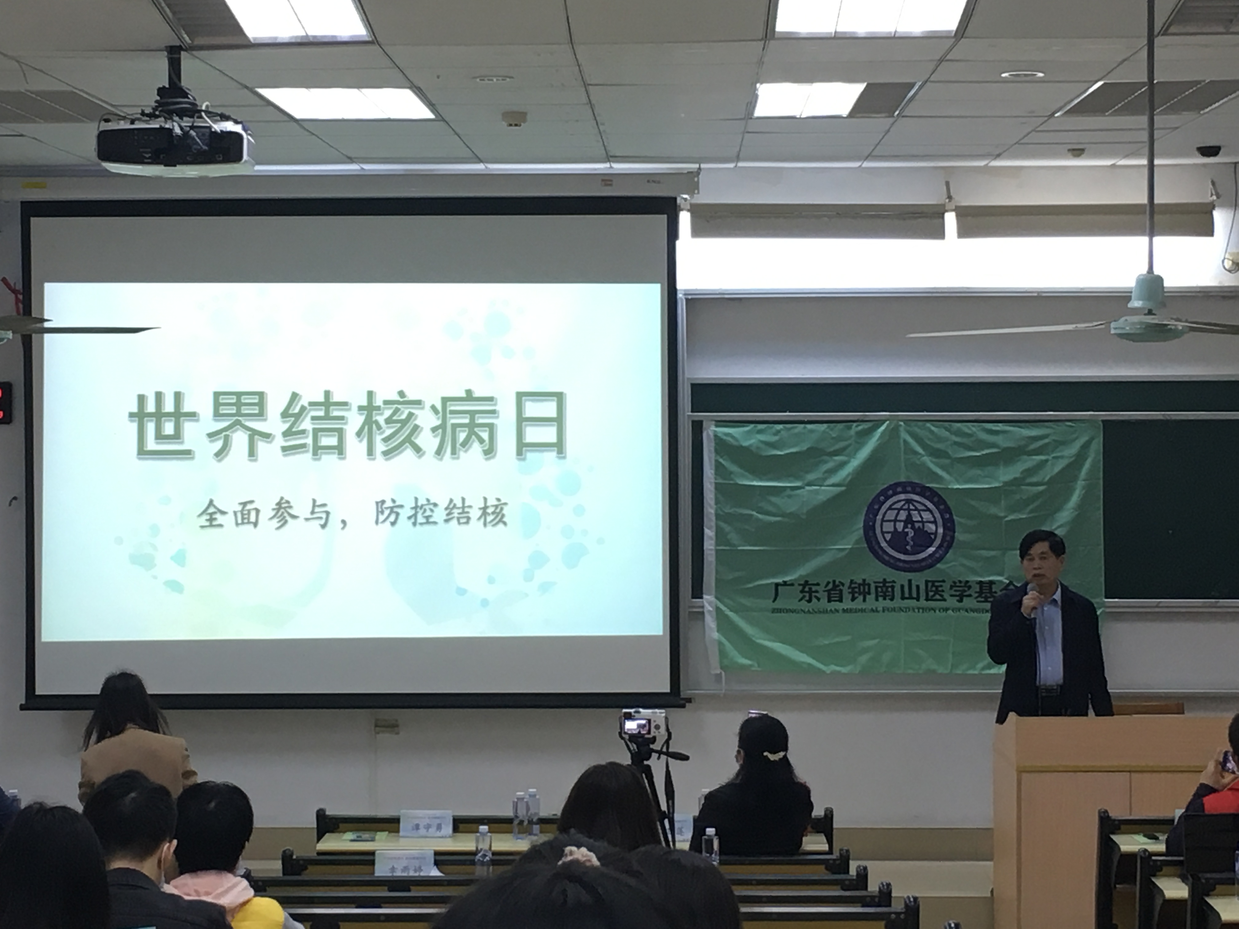 廣州大學分會場邀請了原廣州胸科醫(yī)院譚守勇院長出席結核宣傳活動,譚院長在現(xiàn)場給各位同學們介紹了學校結核病現(xiàn)狀,學校突發(fā)結核疫情的嚴重性以及大家平時應該如何預防結核,呼吁大家不要抽煙,飲食要營養(yǎng)均衡,多進行體育鍛煉,保證充足的睡眠。規(guī)律的生活能夠提高我們的免疫力,從而預防結核感染的可能性。