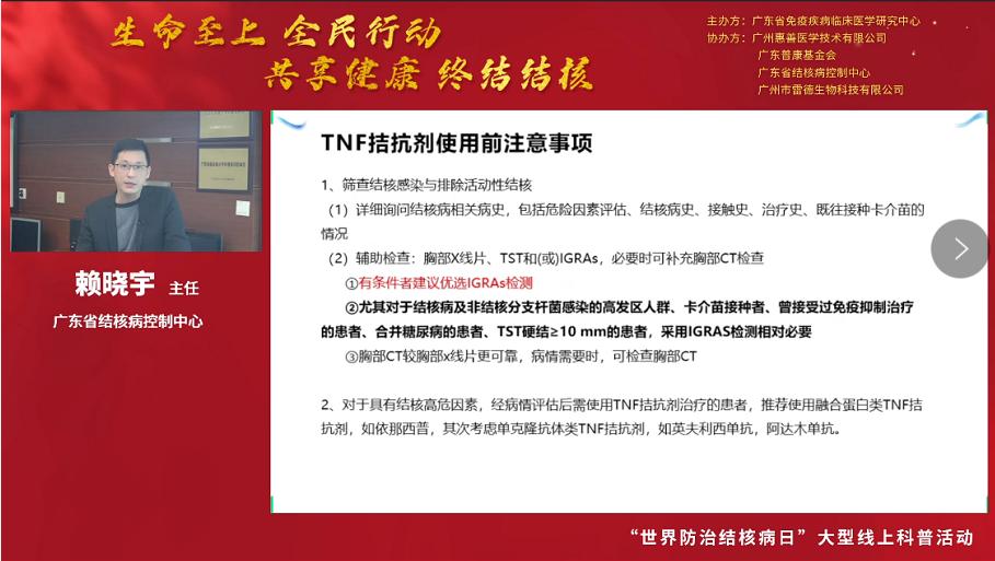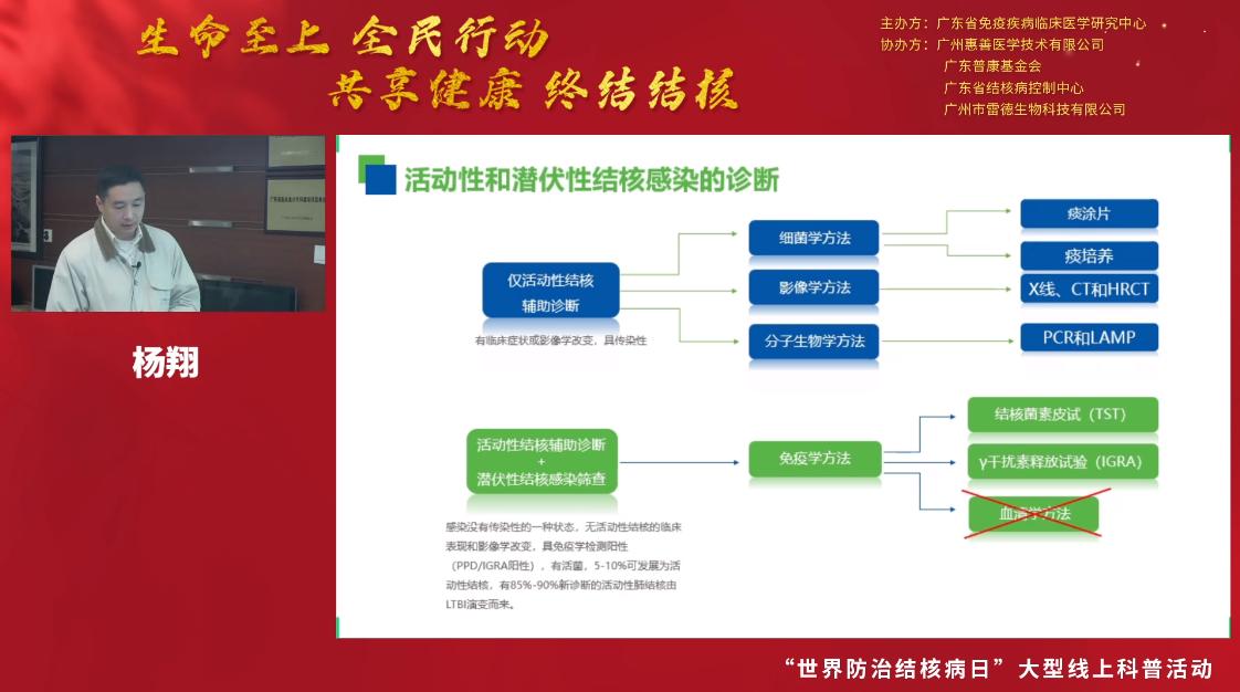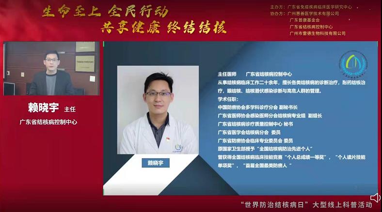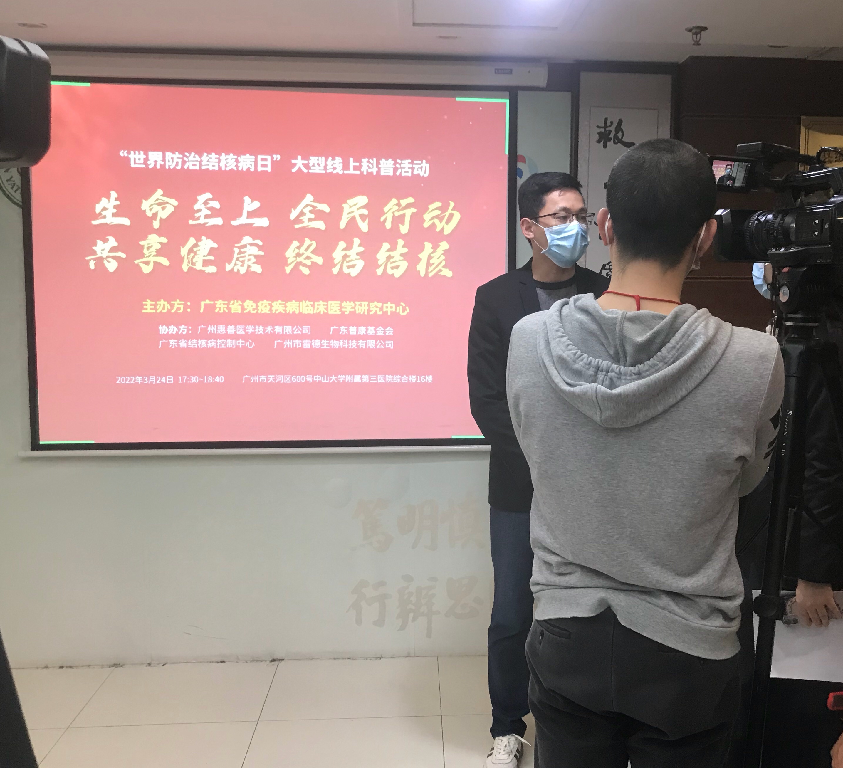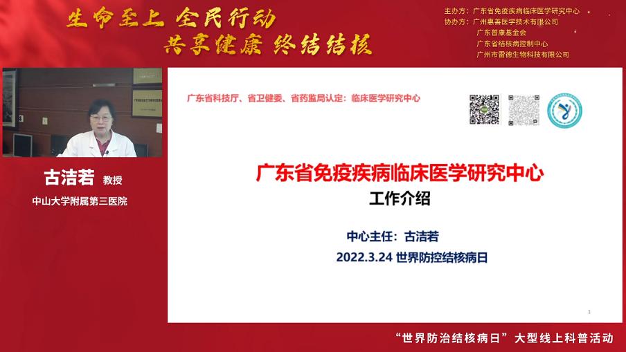 3月24日是第27個(gè)“世界防治結(jié)核病日”,今年的主題是“生命至上 全面行動(dòng) 共享健康 終結(jié)結(jié)核”。為促進(jìn)公眾對(duì)結(jié)核病感染危害及其檢測(cè)手段的了解,引導(dǎo)公眾做好疫情期間結(jié)核病的防控工作,2022年3月24日18:00-20:00,廣東省免疫疾病臨床醫(yī)學(xué)研究中心聯(lián)合廣東省結(jié)核病控制中心和廣州市雷德生物科技有限公司開(kāi)展大型線上結(jié)核防控知識(shí)科普和結(jié)核篩查活動(dòng)。