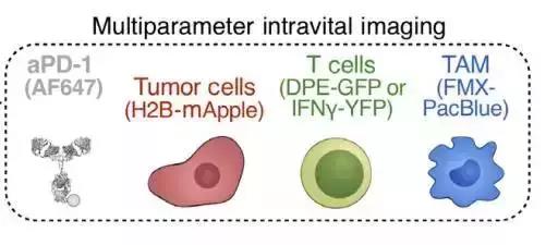 他們發(fā)現(xiàn)在結腸癌模型小鼠體內注射標記的PD-1抗體5分鐘后,就在腫瘤微環(huán)境內的T細胞上發(fā)現(xiàn)了染色標記。這是最早在腫瘤組織中檢測到被標記的細胞。研究人員觀察到,最開始標記的PD-1抗體結合到腫瘤浸潤T細胞周圍而幾分鐘后在T細胞表明形成色塊,之后,這些色塊被發(fā)現(xiàn)都在腫瘤相關巨噬細胞內。