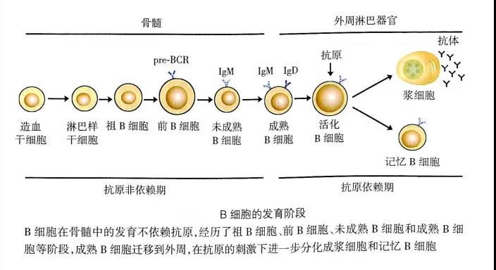 B細(xì)胞在骨髓中的分化發(fā)育需經(jīng)歷祖B細(xì)胞、前B細(xì)胞、未成熟B細(xì)胞、成熟B細(xì)胞等幾個(gè)階段。