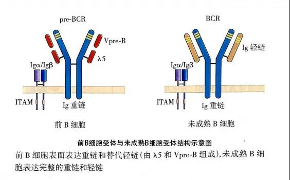 前B細(xì)胞的特征是表達(dá)前B細(xì)胞受體(pre-BCR),并經(jīng)歷大pre-B和小pre-B兩個(gè)階段。Pre-BCR有μ鏈和替代輕鏈(surrogate light chain,包括分別與輕鏈V區(qū)和C區(qū)同源的Vpre-B和λ5兩種蛋白)組成,可抑制另一條重鏈基因的重排(等位基因排斥),促進(jìn)B細(xì)胞的增殖。大pre-B細(xì)胞進(jìn)一步發(fā)育成為小pre-B細(xì)胞,小pre-B細(xì)胞開始發(fā)生輕鏈基因V-J重排,但依然不能表達(dá)功能性BCR。