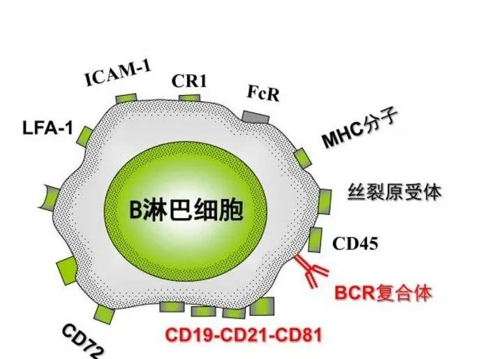 B細(xì)胞還表達(dá)共受體復(fù)合物。B細(xì)胞共受體復(fù)合物由B細(xì)胞表面CD19/CD21/CD81非共價(jià)相聯(lián)形成,主要作用是增強(qiáng)B細(xì)胞對(duì)抗原刺激的敏感性。CD19是所有B細(xì)胞共有的表面標(biāo)志,參與啟動(dòng)信號(hào)轉(zhuǎn)導(dǎo)、生發(fā)中心生成和抗體親和力成熟。CD21主要表達(dá)于成熟B細(xì)胞,為C3d受體,也是B細(xì)胞上的EB病毒受體。CD81和B淋巴細(xì)胞的增值相關(guān)。