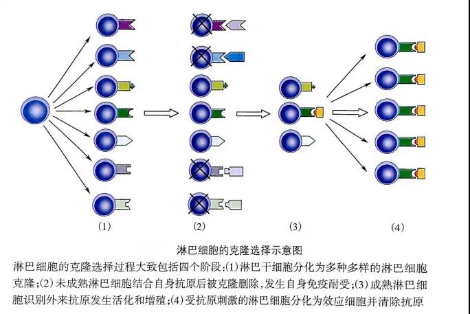 基于克隆選擇學(xué)說,機(jī)體自身的組織抗原成分在胚胎期就被相應(yīng)的細(xì)胞克隆所識(shí)別,相應(yīng)的未成熟淋巴細(xì)胞與機(jī)體自身抗原結(jié)合后被克隆刪除,發(fā)生自身特異性免疫耐受,即賦予機(jī)體免疫系統(tǒng)區(qū)分“自我”和“非己”的能力。值得一提的是,在胚胎期任何進(jìn)入機(jī)體的抗原都將被視作自身成分而產(chǎn)生免疫耐受。