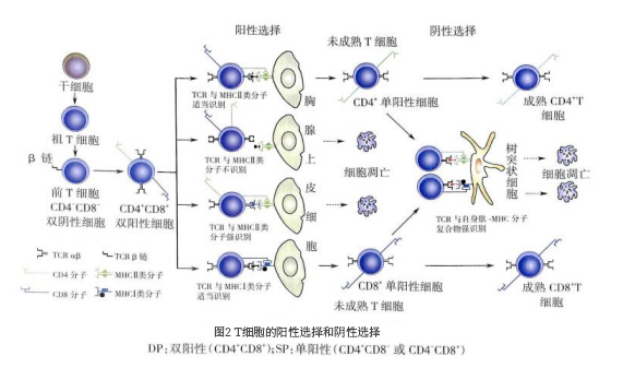 正常機體的成熟T細胞既要對多樣性的非我抗原發(fā)生免疫應答,又要對自身抗原發(fā)生免疫耐受。為達到此要求,在胸腺T細胞的發(fā)育過程中,首先要經(jīng)歷其抗原識別受體(TCR)的基因重排,表達多樣性的TCR,然后經(jīng)歷陽性選擇和陰性選擇。因此,T細胞在胸腺中發(fā)育的最核心事件是獲得多樣性TCR的表達、自身MHC限制性(陽性選擇)以及自身免疫耐受(陰性選擇)的形成(圖1)。